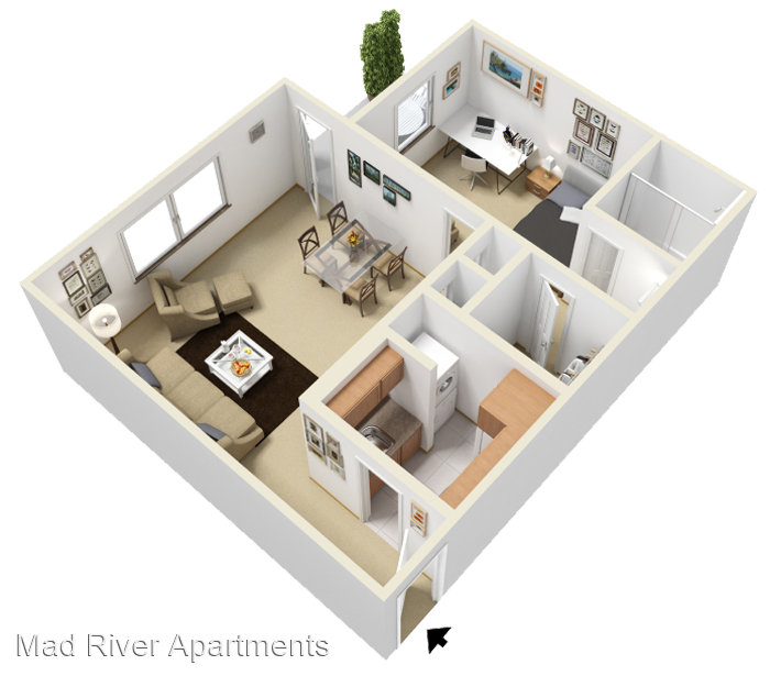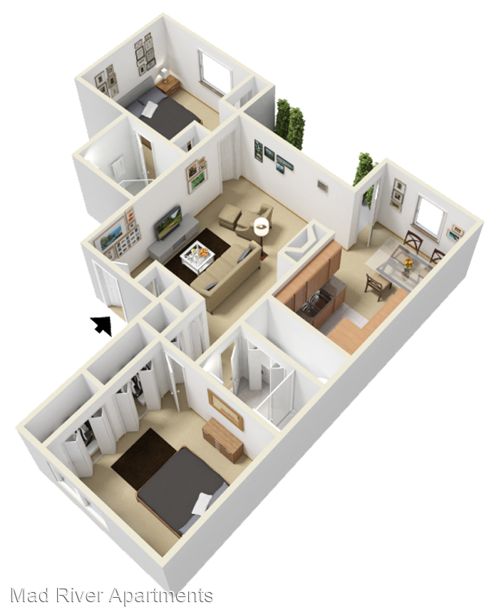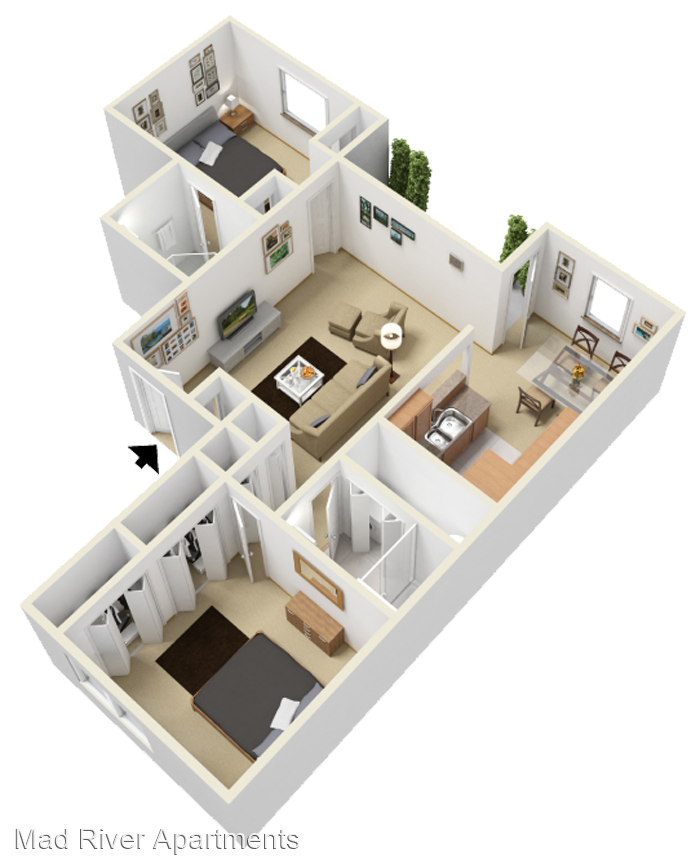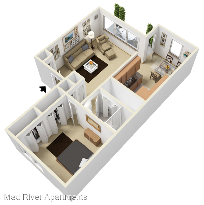 The Riverview - Roomy two bedroom, one bath with ample closet space and full sized washer & dryer. The living room flows perfectly into the dining room, making this spacious two bedroom layout ideal for entertaining. Vaulted Ceilings* Walk-In Closets* Fireplaces* Washer/Dryer Cable Ready *In Select Units